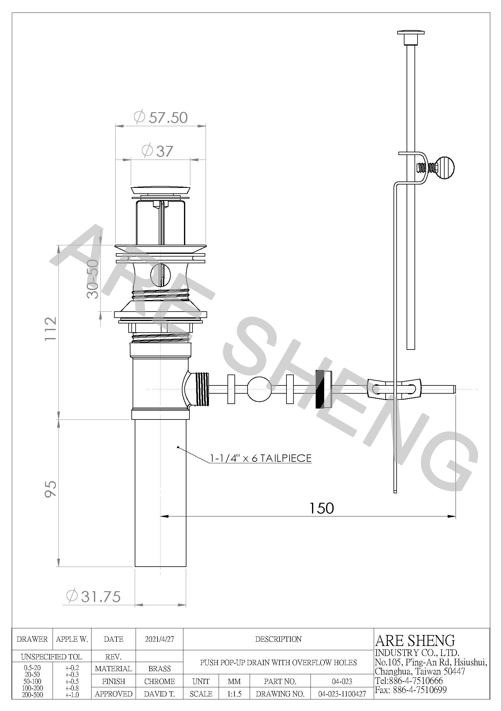 With 1-1/4" brass tailpiece in chrome